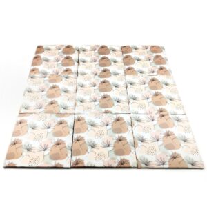Pianka w matach KiddyMate jest obita materiałem i to nie byle jakim, bo ekologiczną bawełną, która jest bardzo przyjemna w dotyku. (Sama się przyznam, że gdy kupiłam swoją pierwszą matę, kładłam na nią różne tkaniny, bo chciałam zwiększyć komfort mojemu maleństwu, żeby nie leżał tak na zimnej, lepkiej macie 🙈 – myślenie opiekuńczej mamy 😄).